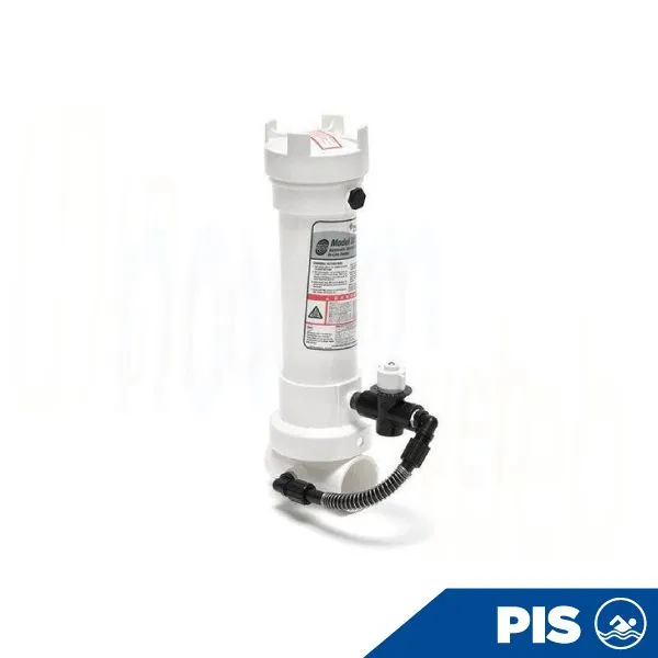 equipo de cloracion semi-automatico a base de tabletas de 1″ o 3″, fabricado en plastico ABS de alta resistencia para instalacion en linea en tuberia de 1 1/2″ o 2″, con valvula de regulacion, para piscinas hasta de 100,000 litros