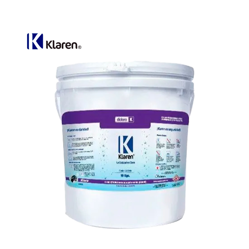 El Dicloro Klaren es un producto que elimina por medio de la oxidación sustancias solubles y que no pueden ser filtradas. Elimina ademas la indeseable cloramia que causa agua turbia e irritación en los ojos y piel. Se utiliza para superclorar rápidamente, lo cual significa elevar el nivel de cloro residual y atacar todos los contaminantes presentes en el agua.