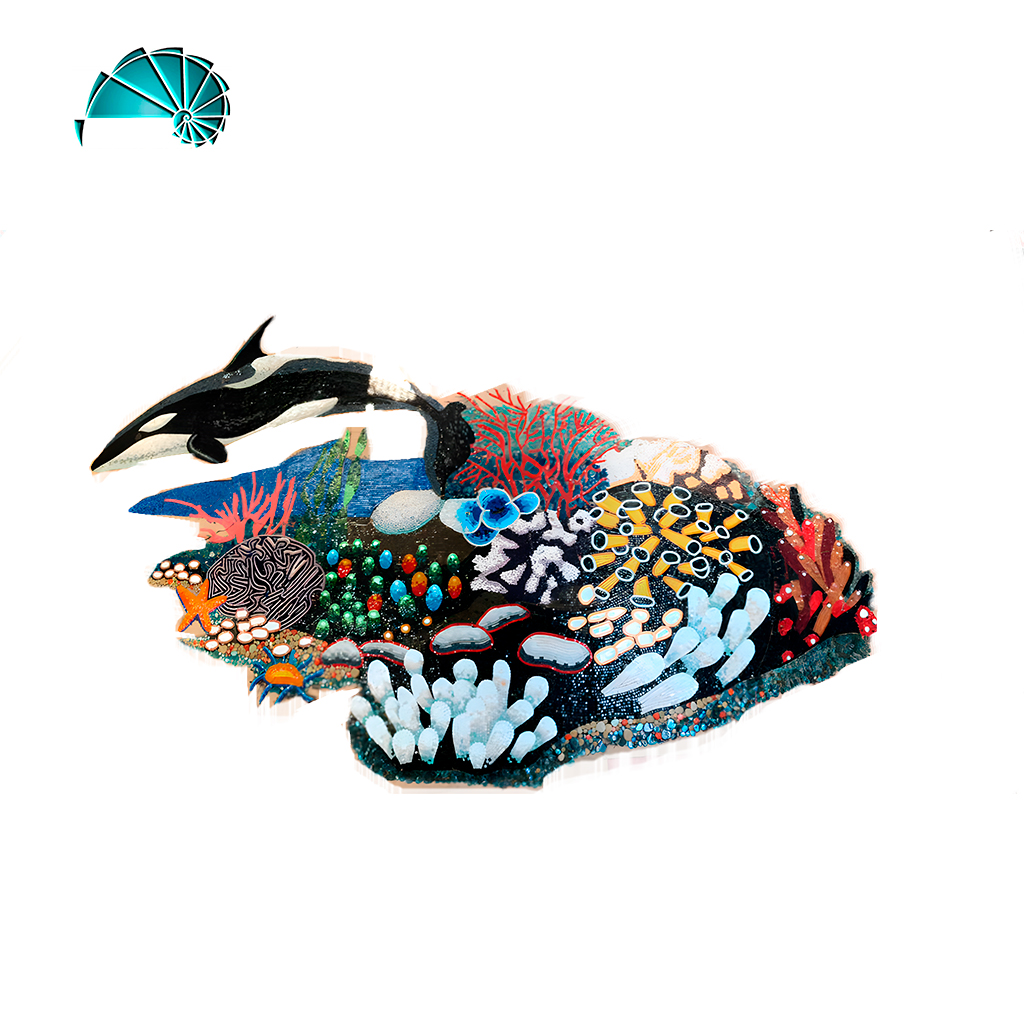 Este colorido mosaico veneciano representa un ecosistema submarino exuberante coronado por una orca en pleno nado. La composición combina una gran variedad de corales, esponjas marinas, peces tropicales, anémonas y elementos decorativos como estrellas de mar, logrando una escena rica en biodiversidad y textura. Las teselas, cuidadosamente seleccionadas en diferentes tamaños, brillos y colores, generan volumen, dinamismo y una sensación inmersiva del fondo marino. La orca, protagonista elegante en blanco y negro, contrasta con la paleta viva del arrecife, aportando fuerza visual a la pieza. Ideal para albercas, muros decorativos o espacios temáticos, este mosaico fusiona arte y naturaleza marina en una obra de alto impacto.