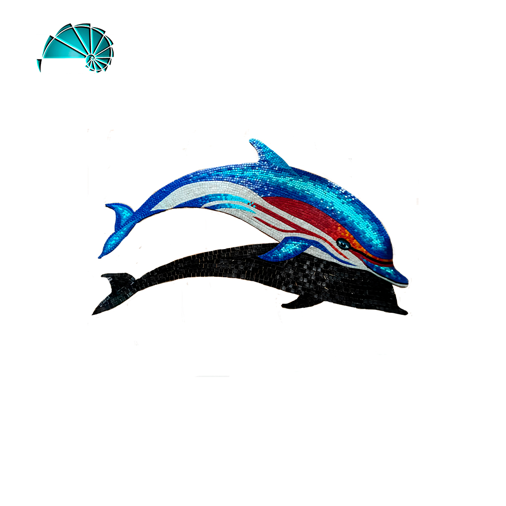 Mosaico de delfín en tonos azules con detalles rojos y sombra decorativa. Ideal para ambientes acuáticos modernos y alegres.