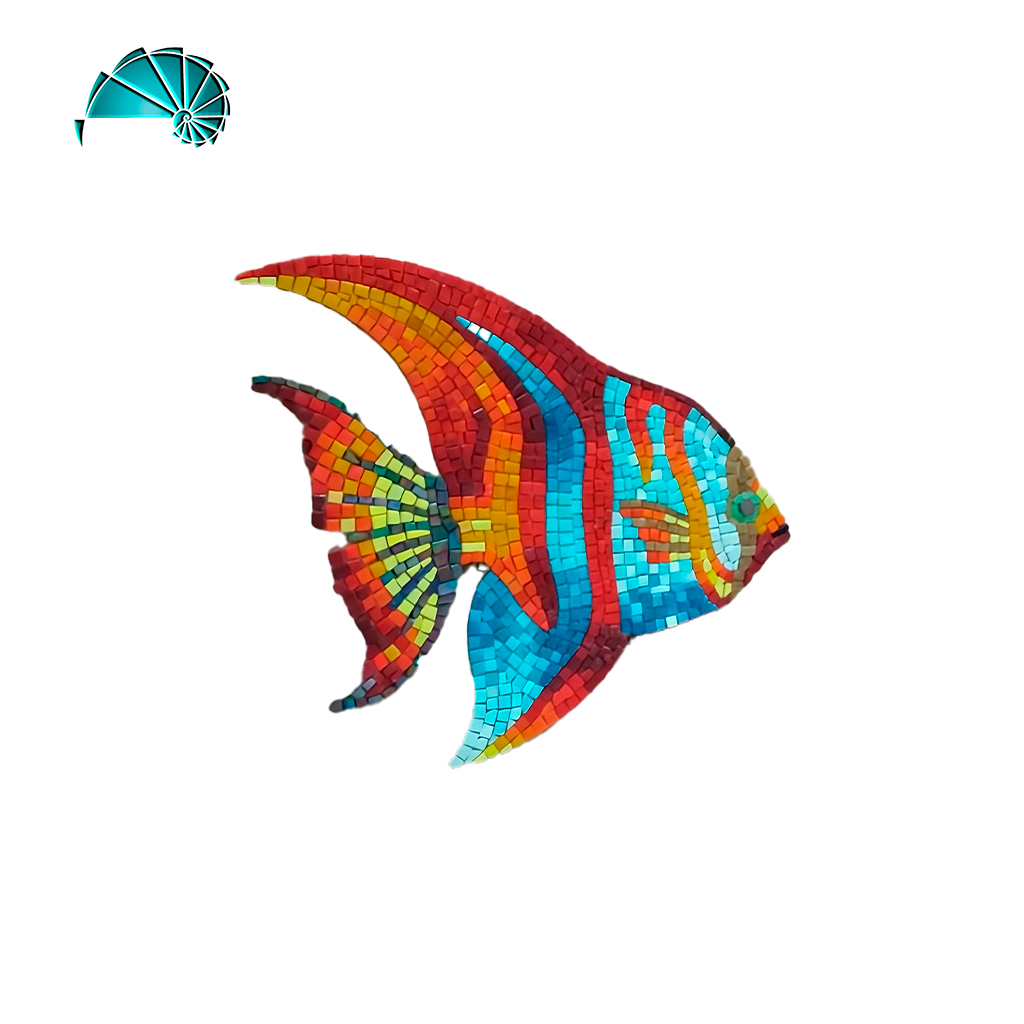 Esta obra en mosaico veneciano representa un pez ángel estilizado, capturado en pleno movimiento, evocando la armonía y la diversidad cromática del mundo marino. Su diseño, de líneas fluidas y contrastes vibrantes, fusiona la precisión artesanal con un enfoque contemporáneo, dando como resultado una pieza dinámica y cautivadora, ideal para ambientes con personalidad artística definida.
