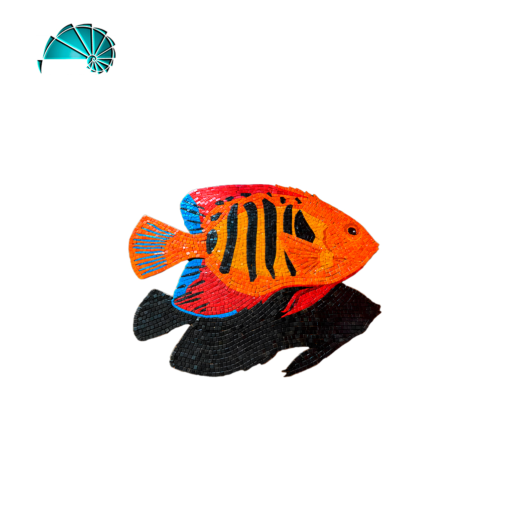 Este mosaico veneciano retrata un pez en tonos intensos de naranja y rojo, con franjas negras que evocan la apariencia de un cíclido o pez fuego. La silueta está finamente delineada con detalles en azul eléctrico en las aletas, generando un contraste llamativo y moderno. La sombra oscura que acompaña al pez en la parte inferior añade volumen y sensación de profundidad, simulando el reflejo en el fondo marino o en una piscina. La técnica artesanal destaca por la disposición precisa de las teselas, que siguen la forma natural del pez, acentuando su dinamismo. Es una pieza ideal para muros acuáticos, spas, fuentes o espacios temáticos que busquen un punto focal vibrante y artístico.