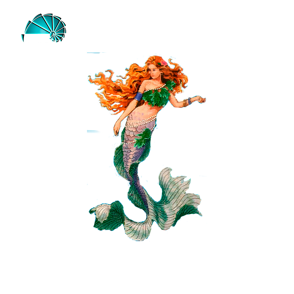 Esta obra representa a una sirena de estilo clásico elaborada en mosaico veneciano, con una estética armoniosa y encantadora. Su larga cabellera rojiza fluye con dinamismo, contrastando con el verde de su top hecho de hojas marinas. Su cola, elegantemente curvada, muestra escamas en tonos lavanda, verde esmeralda y blanco perlado, finalizando en aletas amplias que simulan hojas de lirio acuático.