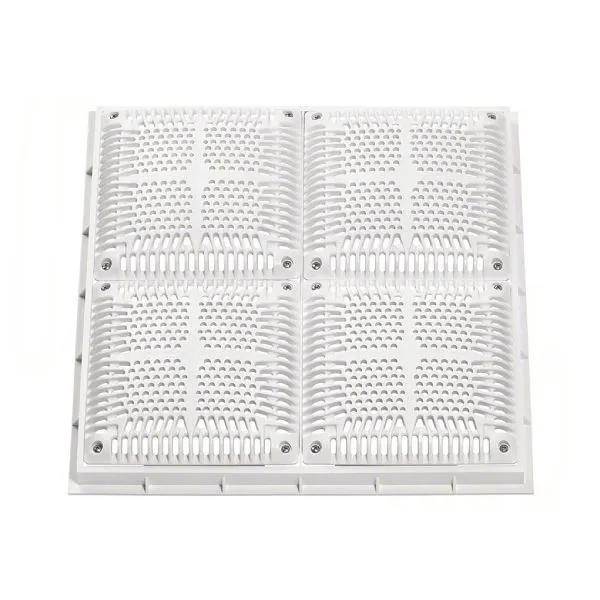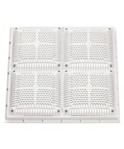 Rejilla para instalación en el fondo de la piscina en un cárcamo de concreto cuanta con una rejilla anti atrapamiento y un marco para ahogarlo en el concreto, para un flujo hasta de 120 gpm, fabricado en plástico ABS y diseñado para sacar el agua o filtrarla desde el fondo de la piscina, uso exclusivo en piscinas residenciales comerciales